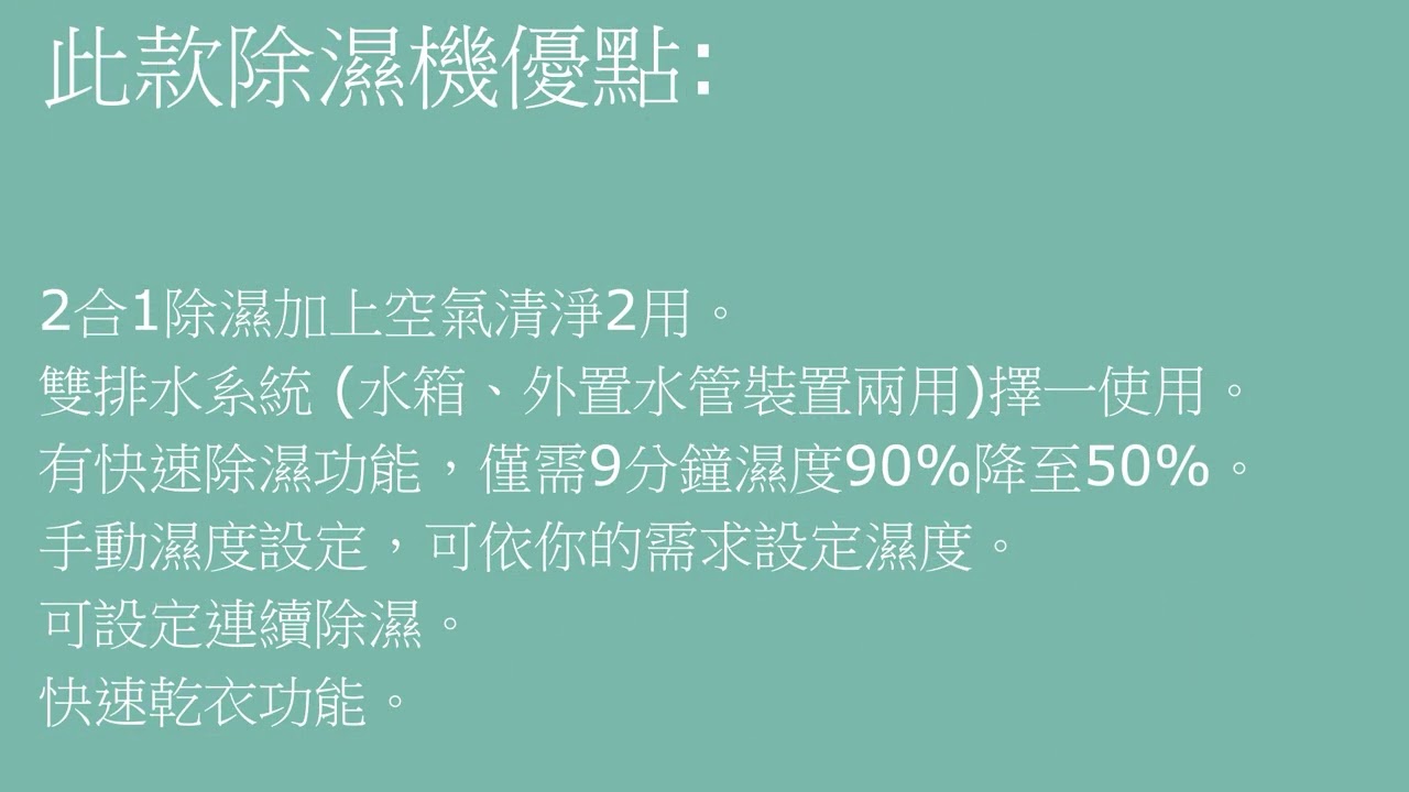 - 有快速除濕功能,僅需9分鐘濕度90%降至50%。