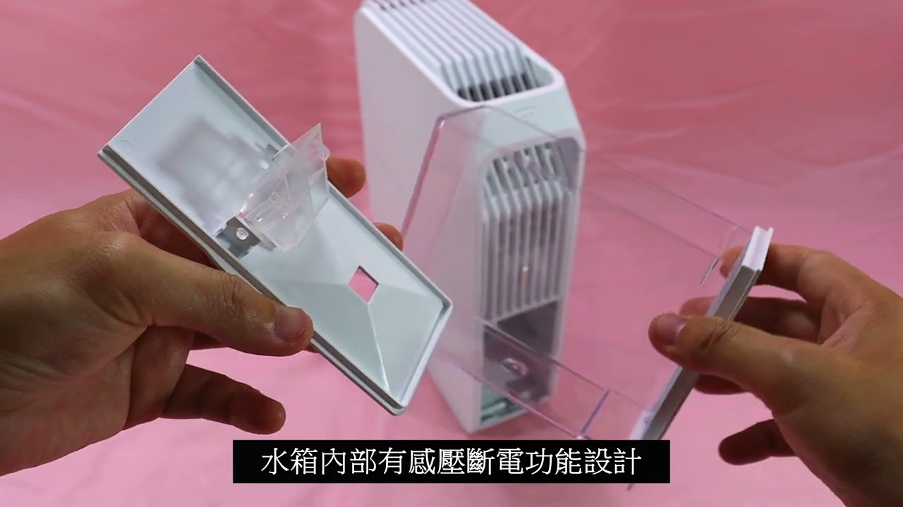 我們來實際查看除濕機的運作方式,先確認水箱是空的狀態,接著把水箱安裝到位。